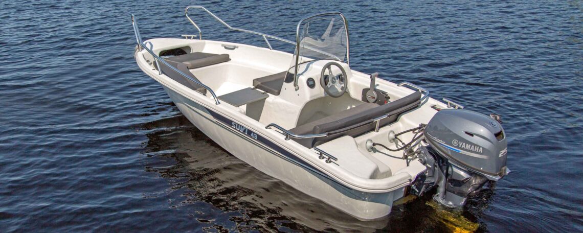 Suvi 43 on mökki- ja kalastuskäyttöön soveltuva ohjauspulpettivene. Mallissa on kaksi lukittavaa säilytystilaa ja pieni keulakansi, jonka alle jää köysiboxi. Suvi 43 on kokoisekseen vakaa ja todella mukava ajettava. Moottoriteho 20-25 hv. Soutumahdollisuus. Lyhyt- tai pitkärikiselle moottorille. Suvi 43 ei ole sadevesityhjenevä. Korvaa poisjäävän Suvi 4230-mallin.