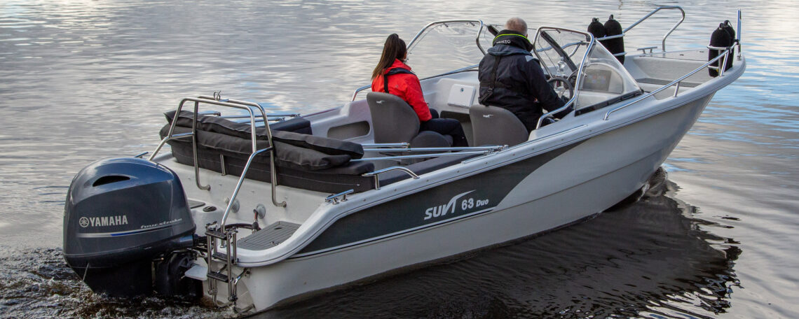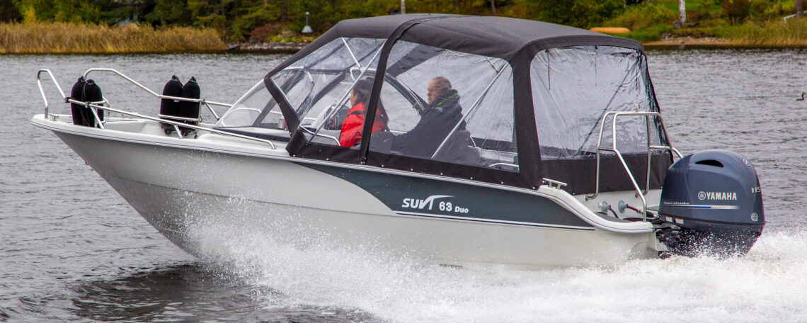 Suvi 63 Duo on reilulla takatilalla ja hyvillä vakiovarusteilla varustettu malli mökki- ja yhteysveneeksi saaristoon ja suuremmille järville. Takapenkki ja sivupenkit muodostavat U-mallisen sohvan, joka uusine selkänojineen sopii hyvin evästaukojen pitämiseen tai muuhun oleskeluun. Lisävarusteena on saatavana uusi suurempi irrotettava pöytä. Myös sivupenkkien alla on lukittavat säilytystilat.