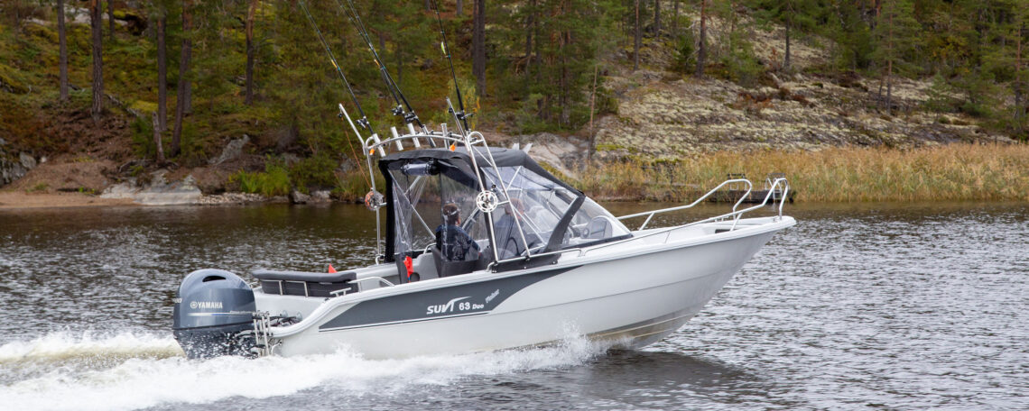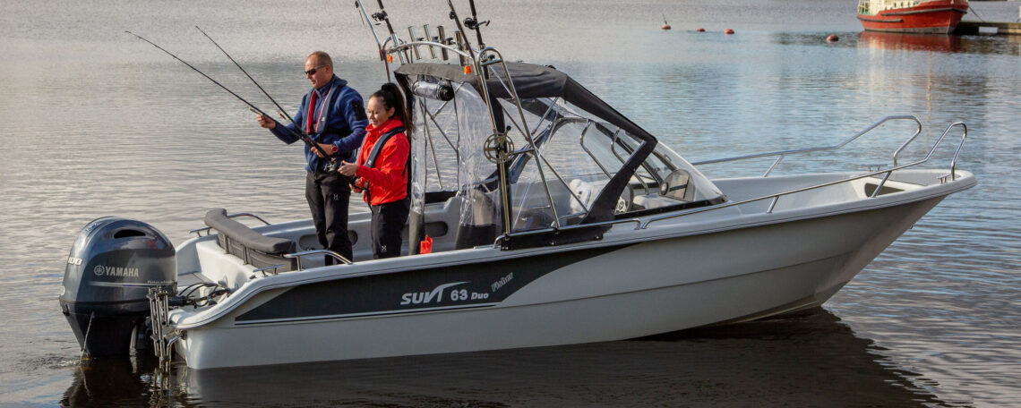Suvi 63 Duo Fisher on kalastajille suunniteltu, kuomulla katettava tuplapulpetillinen uistelu/kalastusvene. Lisävarusteena olevasta perähyttikuomusta voi hankkia etuosan, väliseinän ja takaosan erillään. Fisherissä on sama erinomainen runko ja ajo-ominaisuudet kuin perusmallin 63 Duo:ssa. Irrotettavat takapenkin nurkkapalat antavat entistäkin enemmän taka-avotilaa ja mahdollistaa helpon liikkumisen kalastuksen yhteydessä. Kaksi pitkää säilytystilaa esim. vavoille. Keulakansi Fisher-mallissa on kiinteä ilman luukkua. Köysi/ankkuriboxi on käytettävissä etupenkin selkänojan aukosta. Keulakanteen on helppo pultata vaikka keulamoottori ”taivasankkuri”. Keulamoottorin johdoille valmis putkitus keulasta välipohjan alta takatilaan. Itsetyhjenevä.