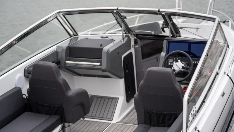 Cross 75 BR:n vakiovarusteisiin kuuluu Cross Q Wide infotainment -järjestelmä, joka tuo kaikki veneesi tärkeimmät ominaisuudet kootusti yhteen paikkaan. Uudessa leveässä Q wide -näytössä voit räätälöidä kaksi näkymää omien mieltymysten mukaisesti, sillä se mahdollistaa useamman näkymän samanaikaisesti. Toiselle näytölle voi valita vaikka merikartan, ja toisella näytöllä voidaan näyttää esimerkiksi moottorin mittaristo. Q wide mahdollistaa myös useamman karttanäkymän käyttämisen saman aikaisesti ja kartta-alueiden koon määrittämisen joustavasti. Q infotainment- järjestelmästä löydät muun muassa ajotietokoneen, karttaplotterin sekä monipuolisen viihdejärjestelmän. Järjestelmään kuuluu vakiona Q-näytön digitaalinen kytkinpaneeli, jonka kautta voit hallita esimerkiksi valojen sekä lisävarusteina saatavien lämmittimen ja jääkaapin katkaisijoita, mukavasti suuren kosketusnäytön kautta.