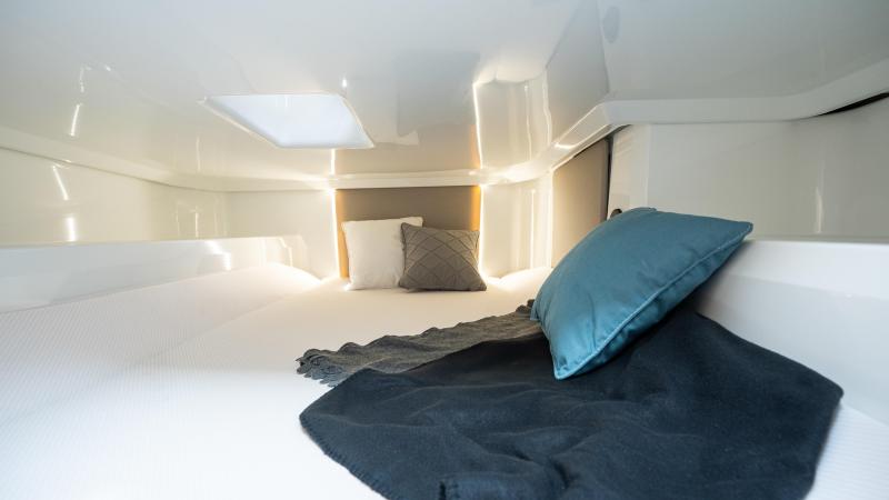 Keulassa on avara makuukajuutta, joka on suurten runkoikkunoiden ansiosta hyvin valoisa. Kannella on lisäksi avattava luukku, josta on helppo laskea tavarat suoraan keulahyttiin. Paapuurin puolella kulkusyvennyksen alla on mukava divaani, josta avautuvat upeat näkymät ulos vieressä olevasta runkoikkunasta. Lisäksi keulassa on erillinen, tilava wc. Keulakajuutasta on pääsy myös avotilan alle sijoittuvaan toiseen tilavaan makuukajuuttaan, jossa kaksi aikuista yöpyy mukavasti