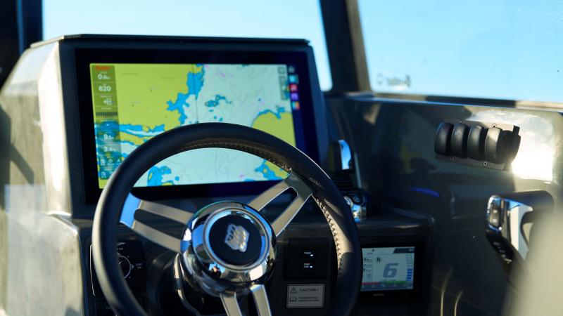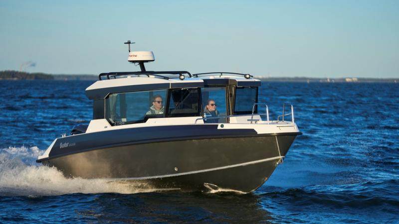 Keulassa on suuri, tilavuudeltaan 350 litrainen säilytystila, jonne on helppo sijoittaa matkatavaroita venettä lastattaessa. Kattokaiteet mahdollistavat kevyiden kattokuormien kuljetuksen. Katon takaosan tukevaan targakaareen voi kiinnittää erilaisia lisävarusteita, kuten vapaputkia, hakuvalon ja tutkan. Sisällä oikean puolen takapenkin alla on iso säilytystila, vasemmalla puolella on paikka lisävarusteena saatavalle jääkaapille. Ohjaamon vakiovarustukseen kuuluu mahtavan kokoinen 16" Buster Q -älynäyttö. Kartturin istuimen kippiselkänoja mahdollistaa istumisen kasvot menosuuntaan tai seurustelun pöydän (lisävaruste) ääressä takana istuvan kanssa. Istuinten tyylikkäät kuosit korostavat osaltaan matkustamon korkealaatuista vaikutelmaa. Kajuutta on läpikuljettava, jonka lisäksi peräkannelta keulaan pääsee ulkokautta kajuutan oikealta puolelta.